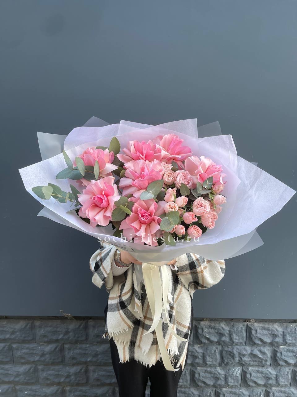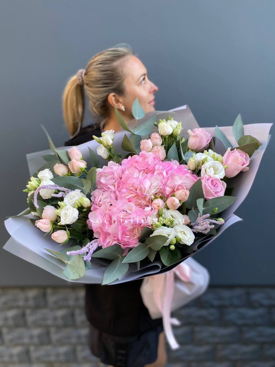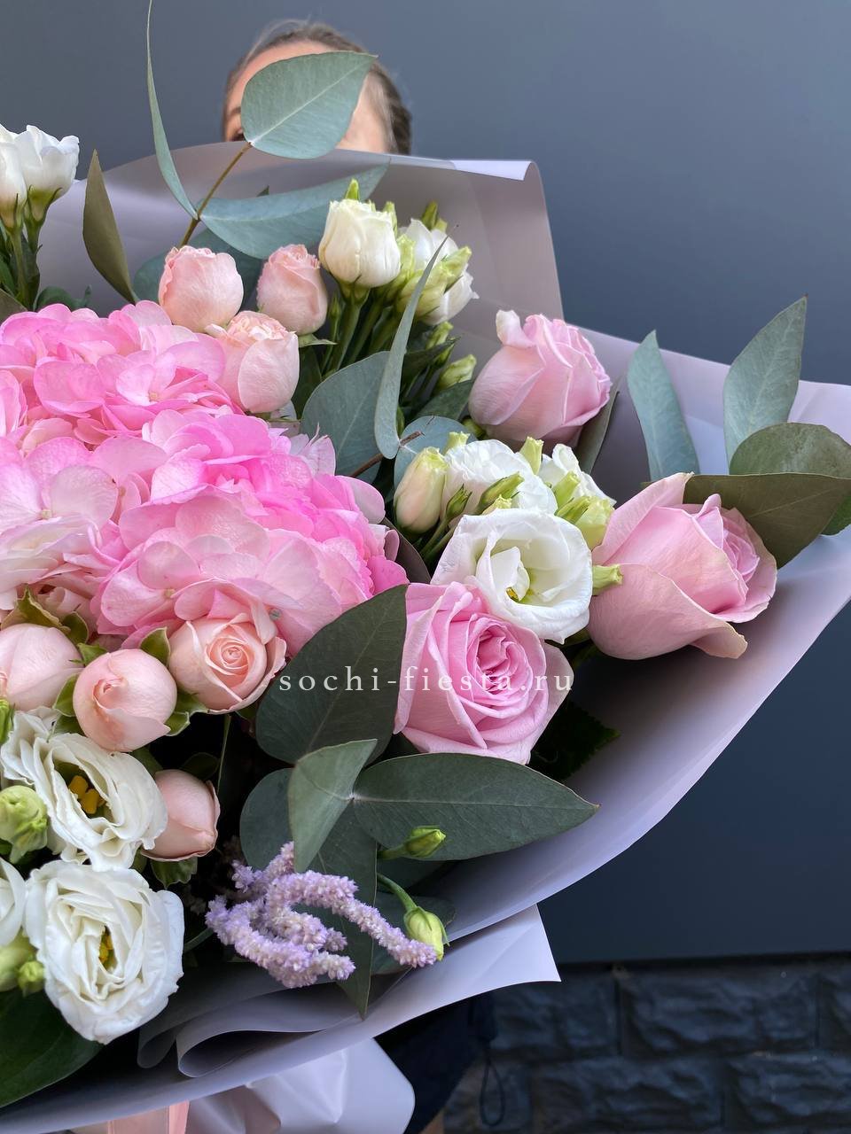 гортензия, пионовидная кустовая роза, розовая роза, хризантема, эвкалипт, лента, дизайнерская пленка.