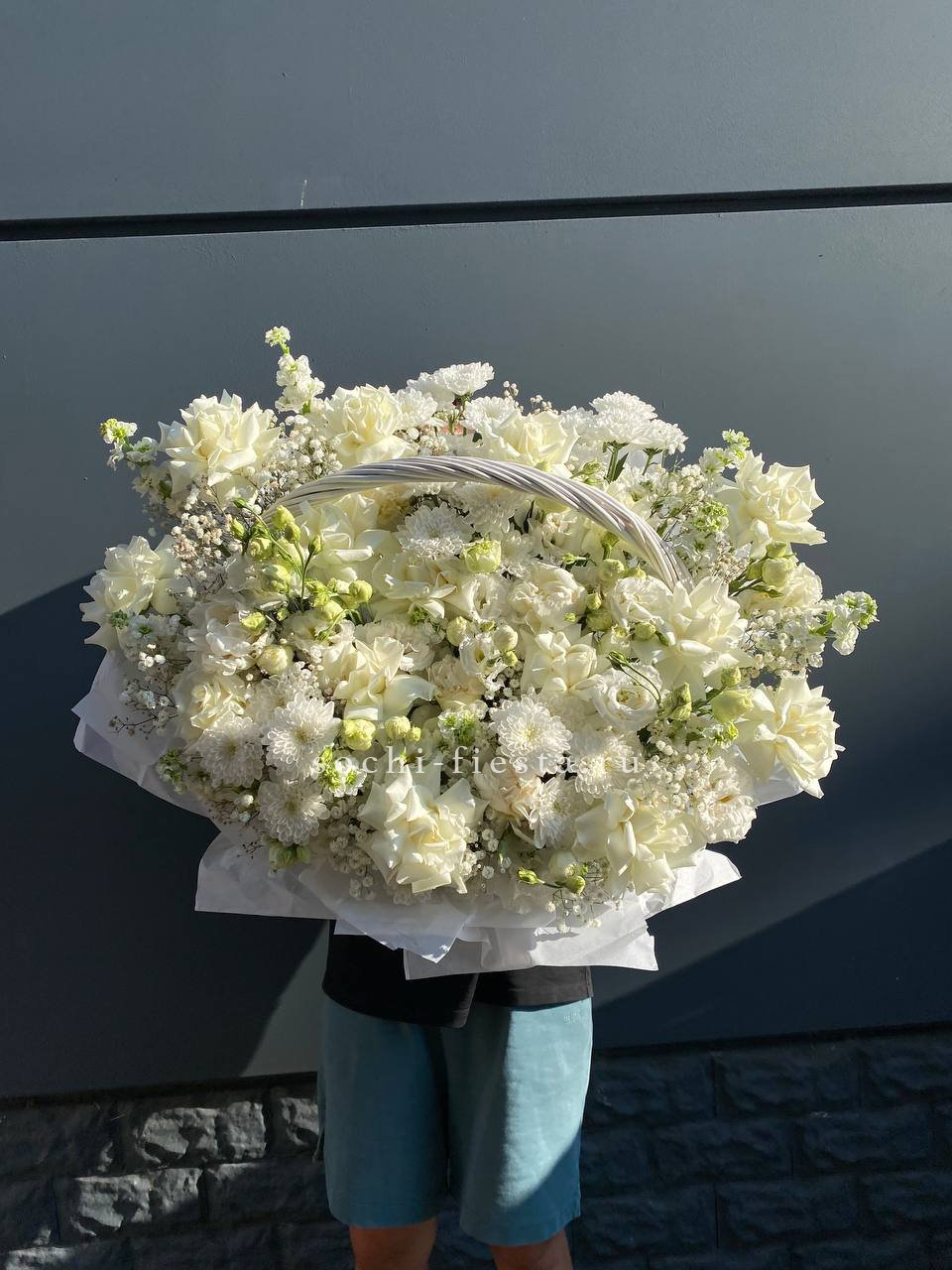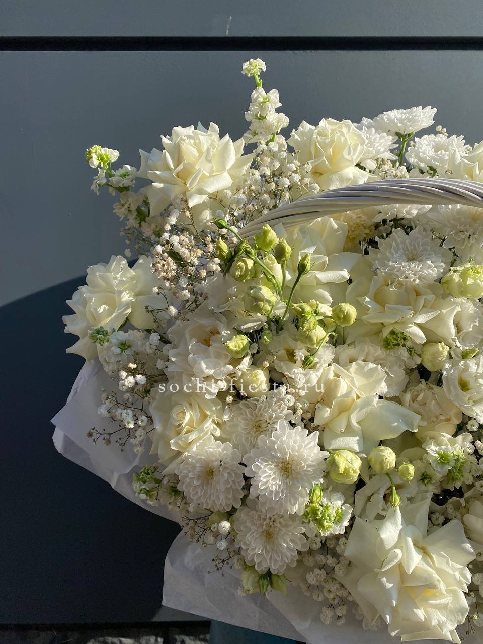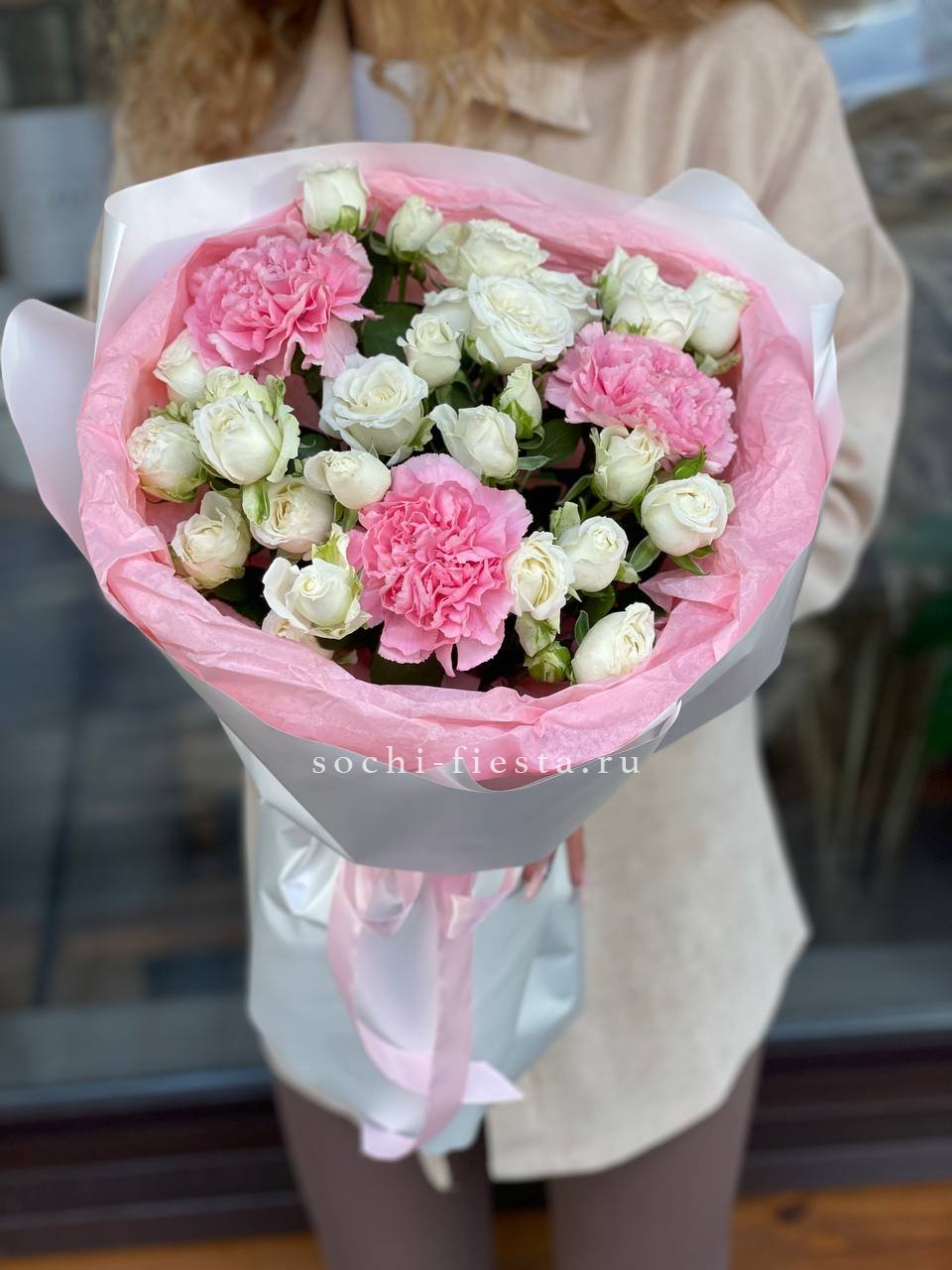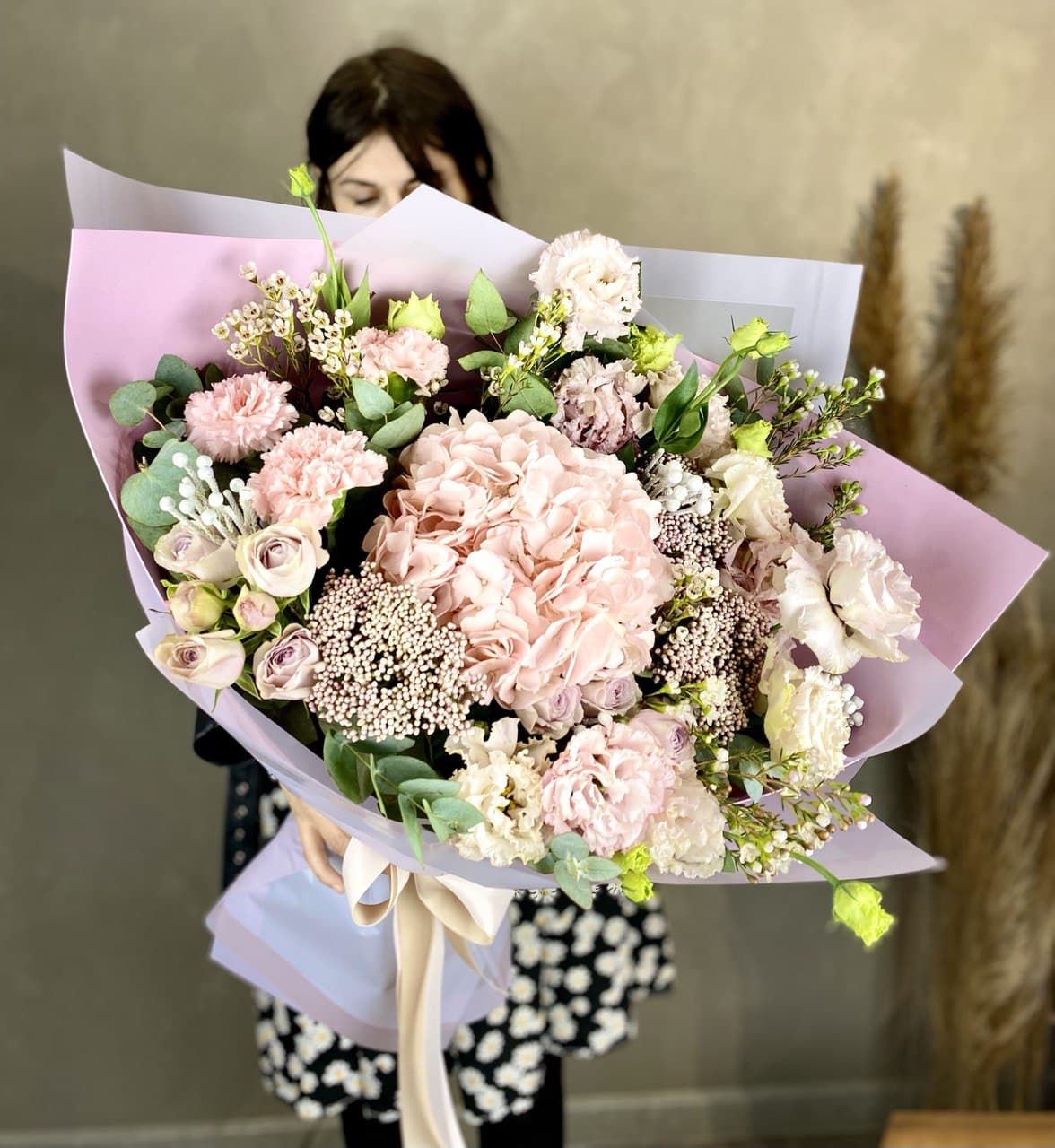 гортензия, пионовидная кустовая роза, розовая роза, хризантема, эвкалипт, лента, дизайнерская пленка.