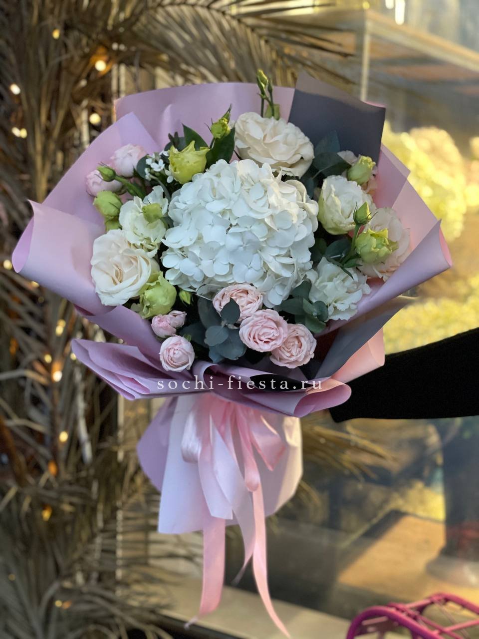 Пышная шапка гортензии уравновешивает вертикальные стрелы антиринума, а джумилия добавляет глубину бордовыми акцентами. Композиция построена на чередовании плотных соцветий и воздушных метёлок лимониума.