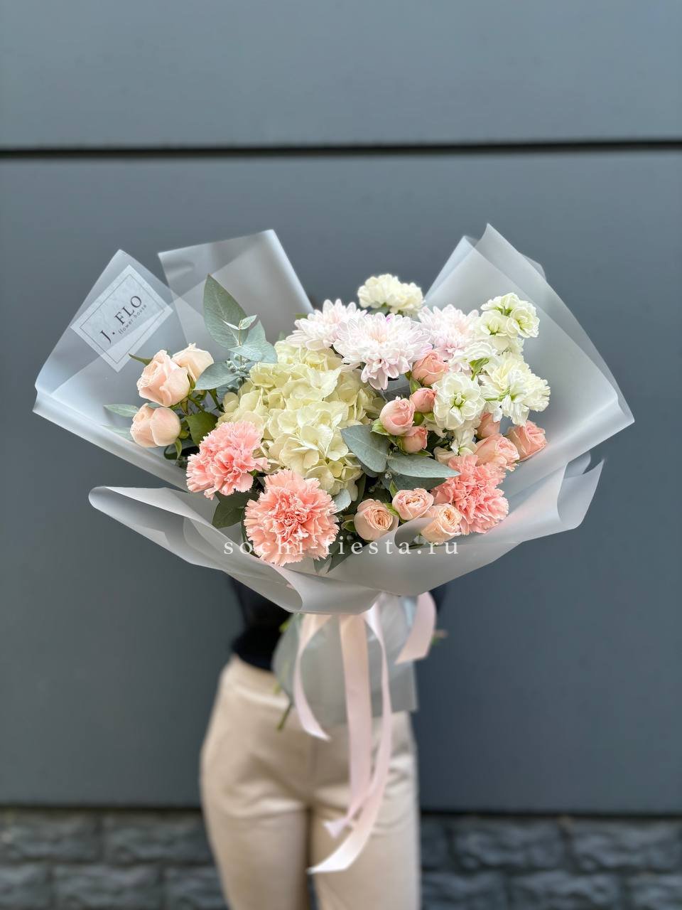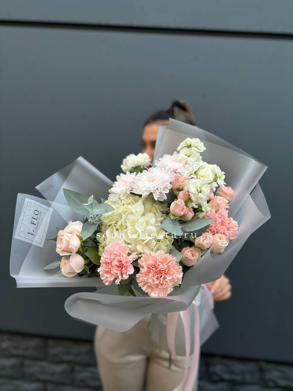 Букет объединяет хризантемы, диантусы, розы, эустому и гортензию в плотную композицию. Корейская пленка удерживает форму и создает графичный силуэт с четкими границами.