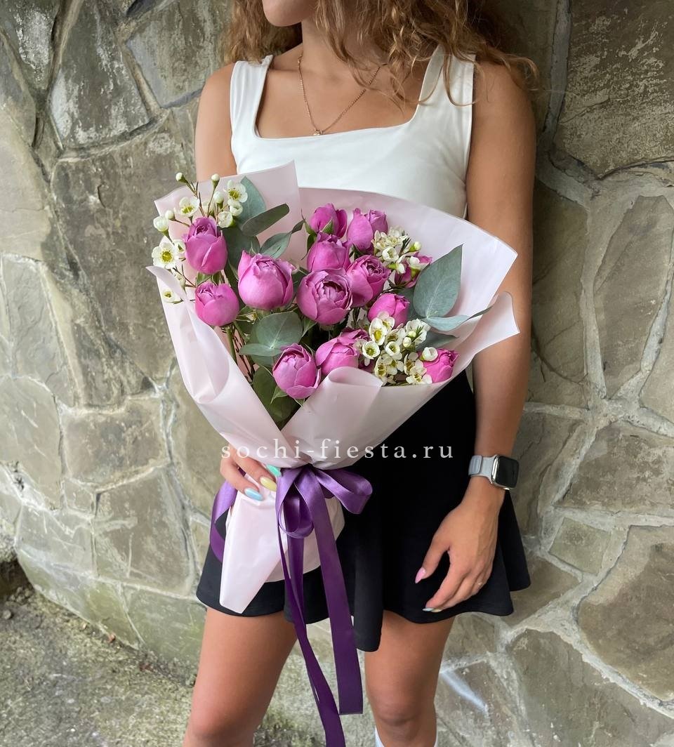 хризантемы, диантусы, розы, эустома, гортензия, лента, корейская пленка.