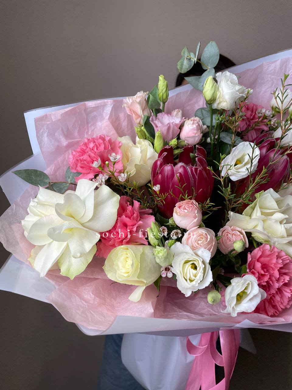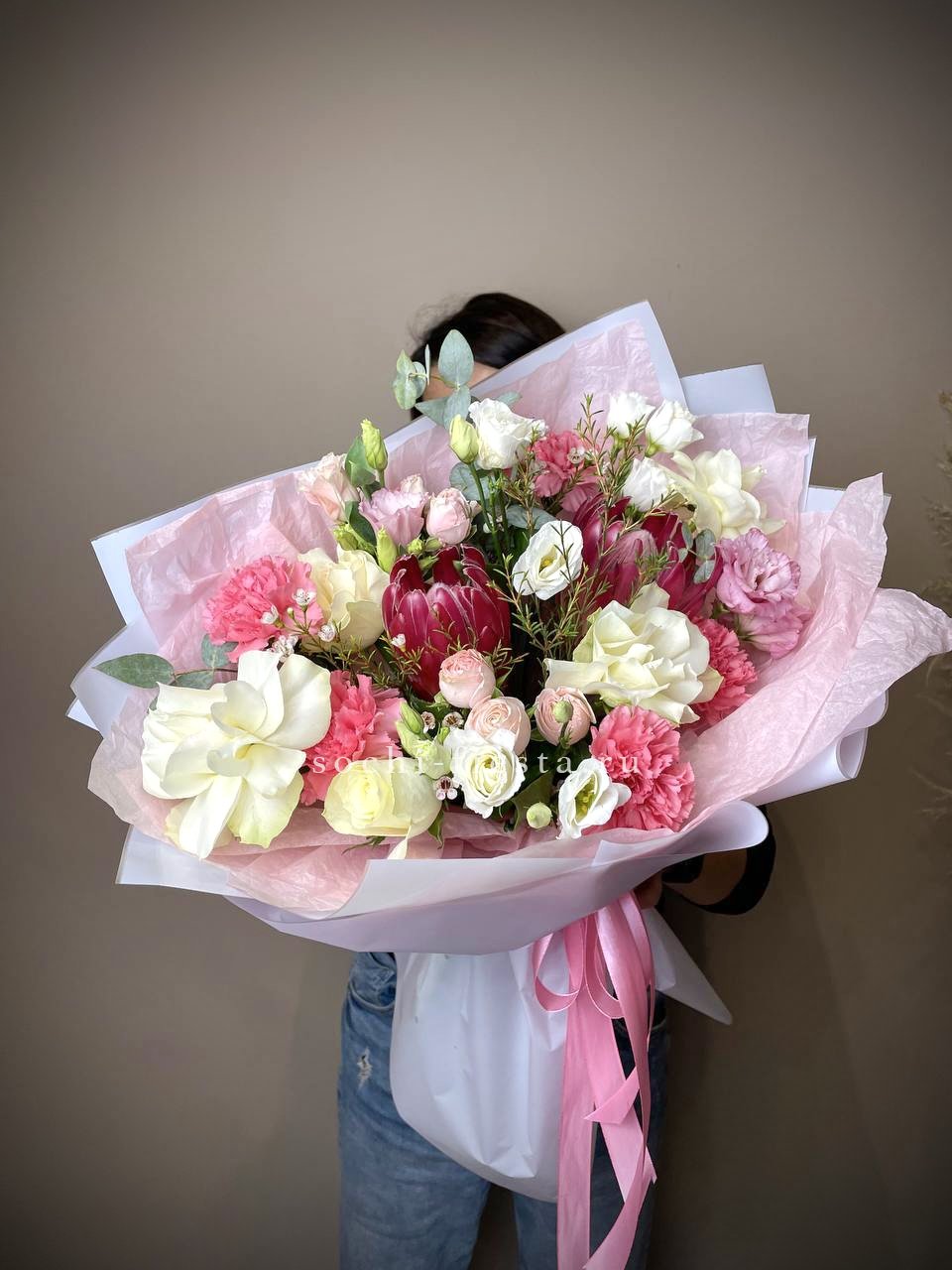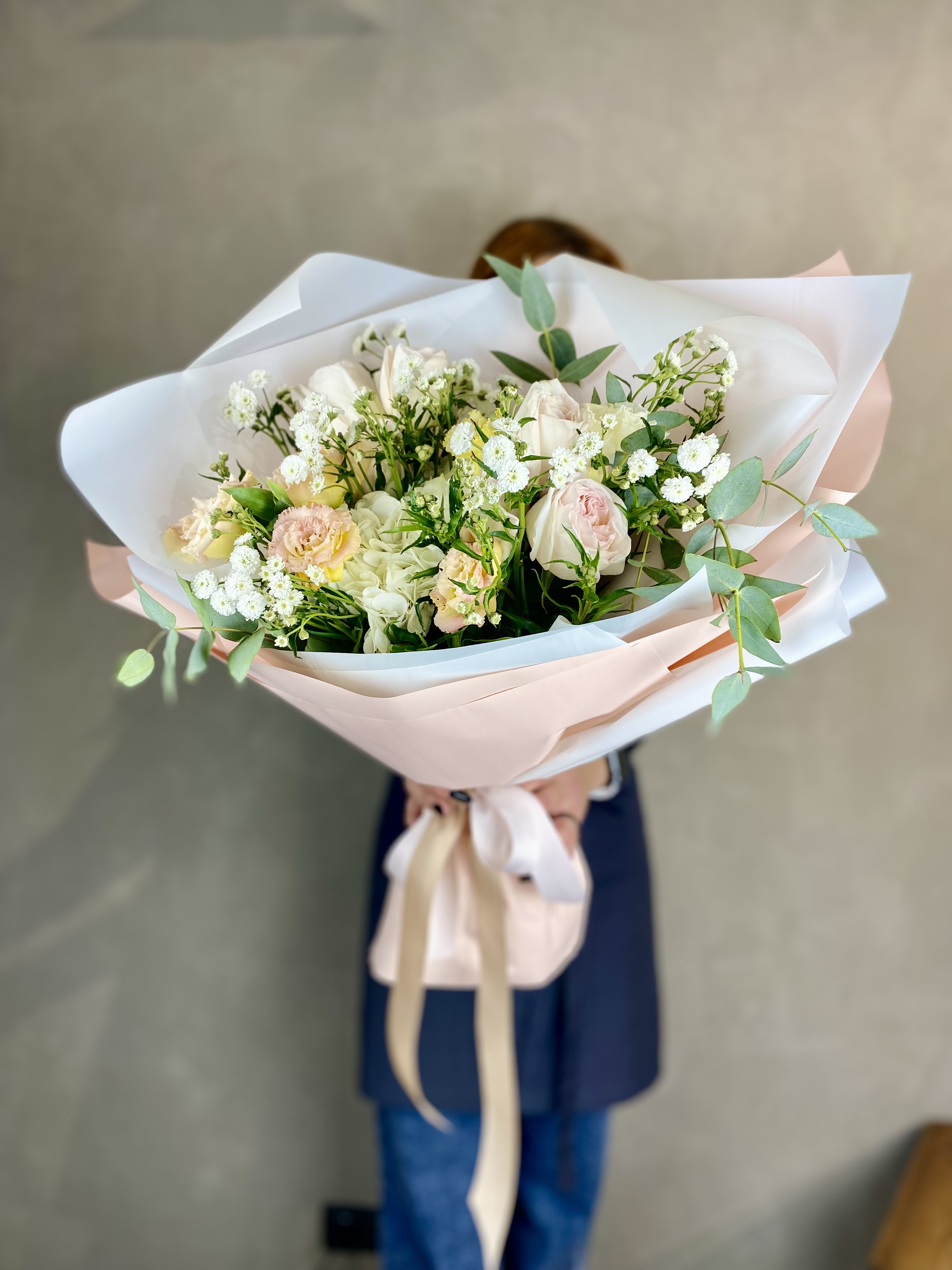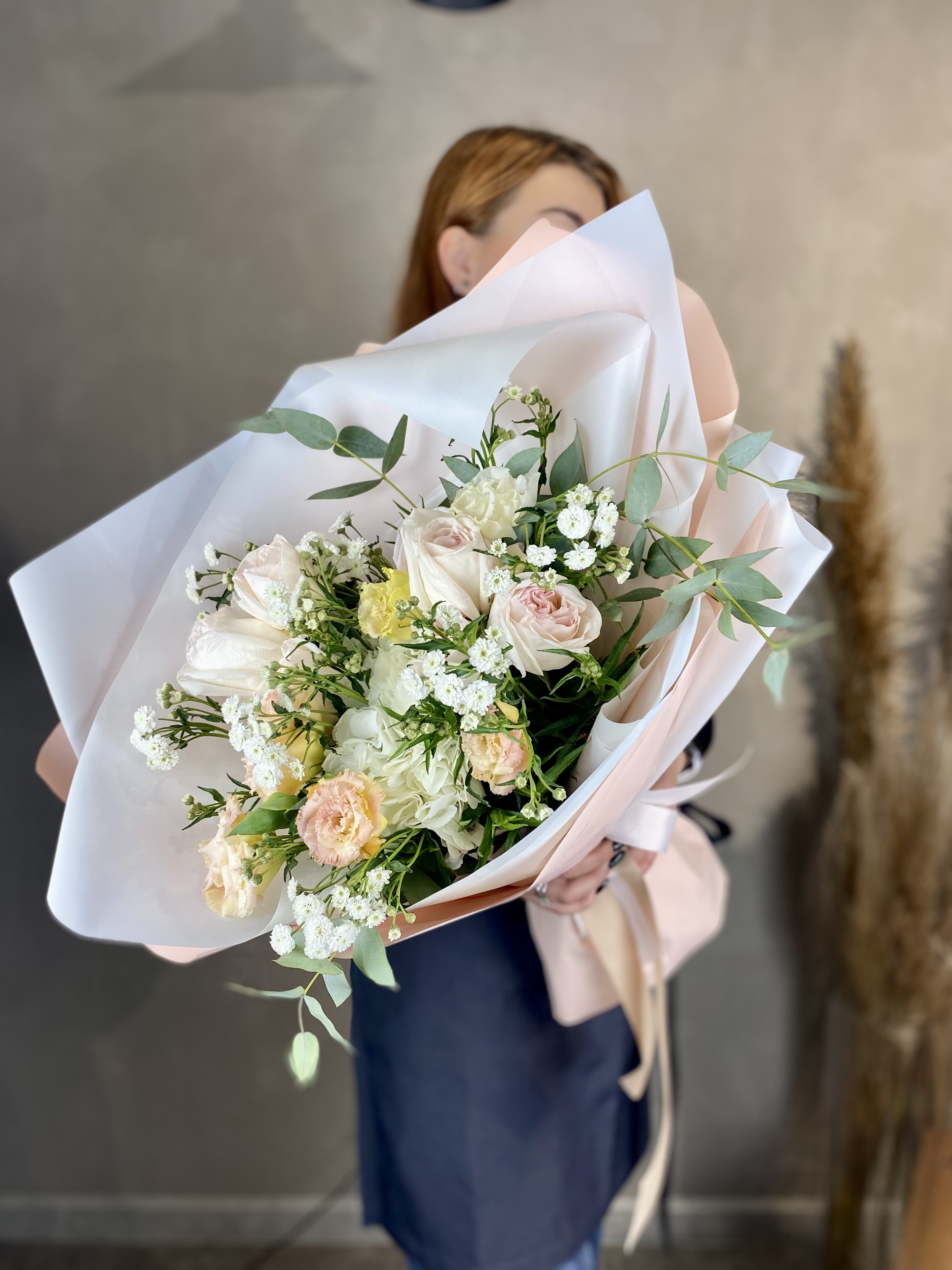 Букет держит форму за счёт зелени, которая создаёт лёгкий каркас вокруг цветов. Эвкалипт добавляет матовые оттенки, маттиола вносит текстурные всплески между бутонами роз.