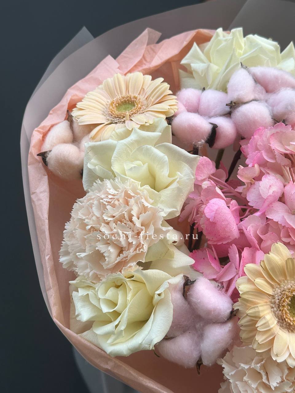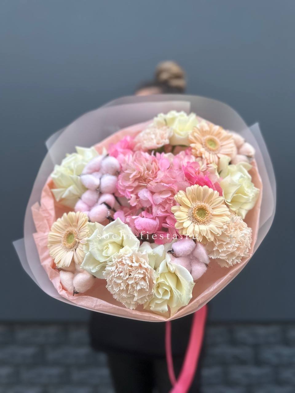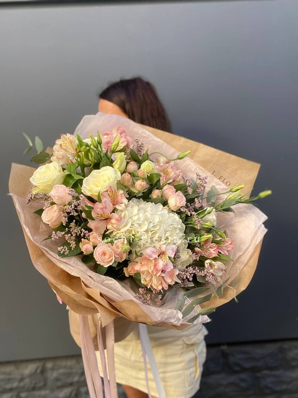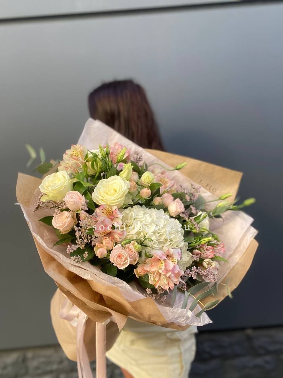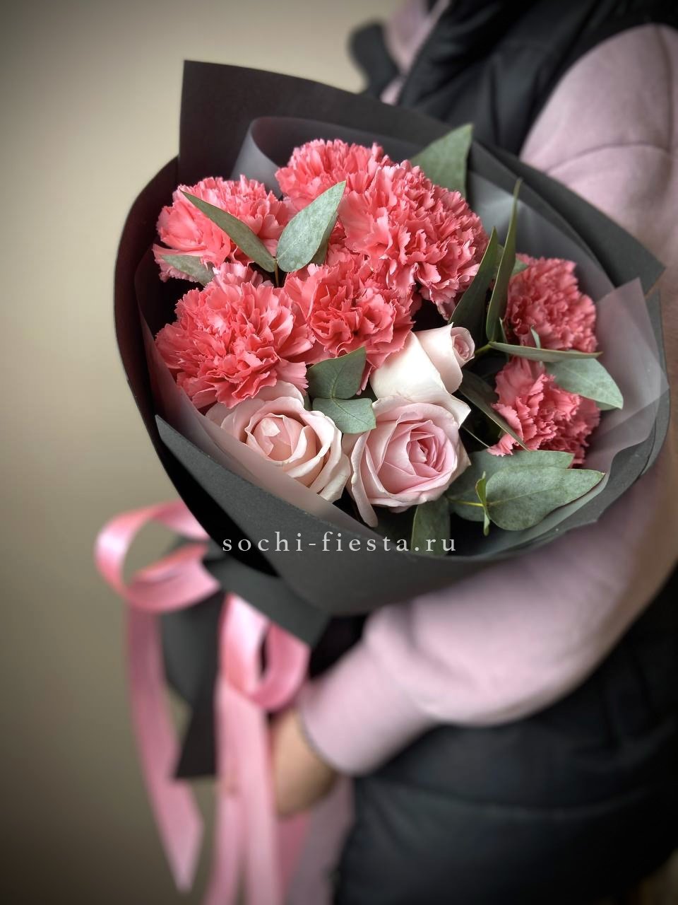 Букет держит форму за счёт зелени, которая создаёт лёгкий каркас вокруг цветов. Эвкалипт добавляет матовые оттенки, маттиола вносит текстурные всплески между бутонами роз.