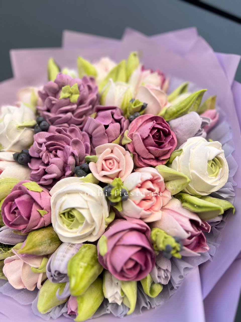 зефир в форме букета цветов. Состав: сахар, патока, пектин, агар, яблочное пюре, яичный белок, натуральный краситель, лимонная кислота. Цена за 1букет, размер М.
